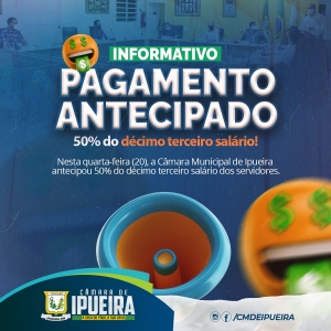 Nesta quarta-feira (20), a Câmara Municipal de Ipueira antecipou o pagamento referente a 50% do décimo terceiro salário de seus servidores. De acordo com o presidente da Câmara, a antecipação é a continuação de um trabalho que enaltece o esforço de cada um dos servidores.