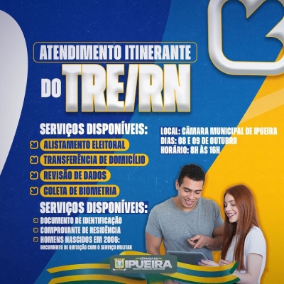 O Tribunal Regional Eleitoral do RN estará realizando atendimento itinerante na Câmara Municipal de Ipueira, nos dias 08 e 09 de outubro, das 8h às 16h.