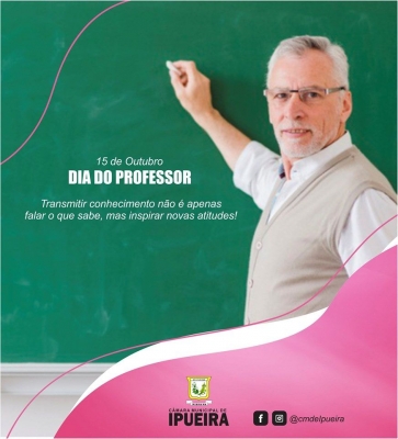 Em razão da comemoração do dia do professor, a Câmara Municipal de Ipueira agradece e parabeniza toda a classe acadêmica e profissional pela sua data expressiva.