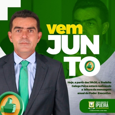 Hoje, a partir das 19h30 o Prefeito Municipal, Galego Paiva estará realizando a leitura da mensagem anual do poder executivo.