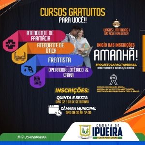 Não perca essa oportunidade! Inscrições dias 02 e 03 de setembro, na Câmara Municipal de Ipueira, das 08h às 17h.
