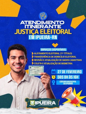 A Câmara Municipal de Ipueira informa que o município receberá, no dia 27 de fevereiro de 2026, o Atendimento Itinerante da Justiça Eleitoral, com oferta de serviços essenciais à regularização da situação eleitoral da população.