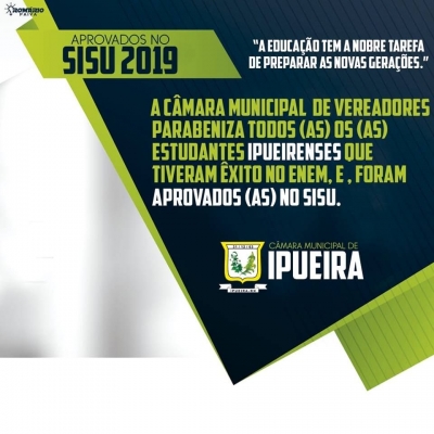 A Câmara Municipal de Ipueira parabeniza todos alunos aprovados no Sisu 2019